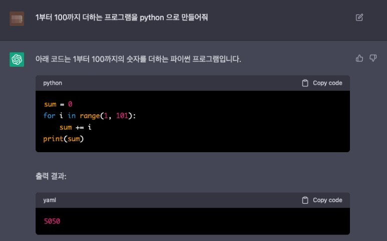 (질문 : 1부터 100까지 더하는 프로그램을 python 으로 만들어줘)