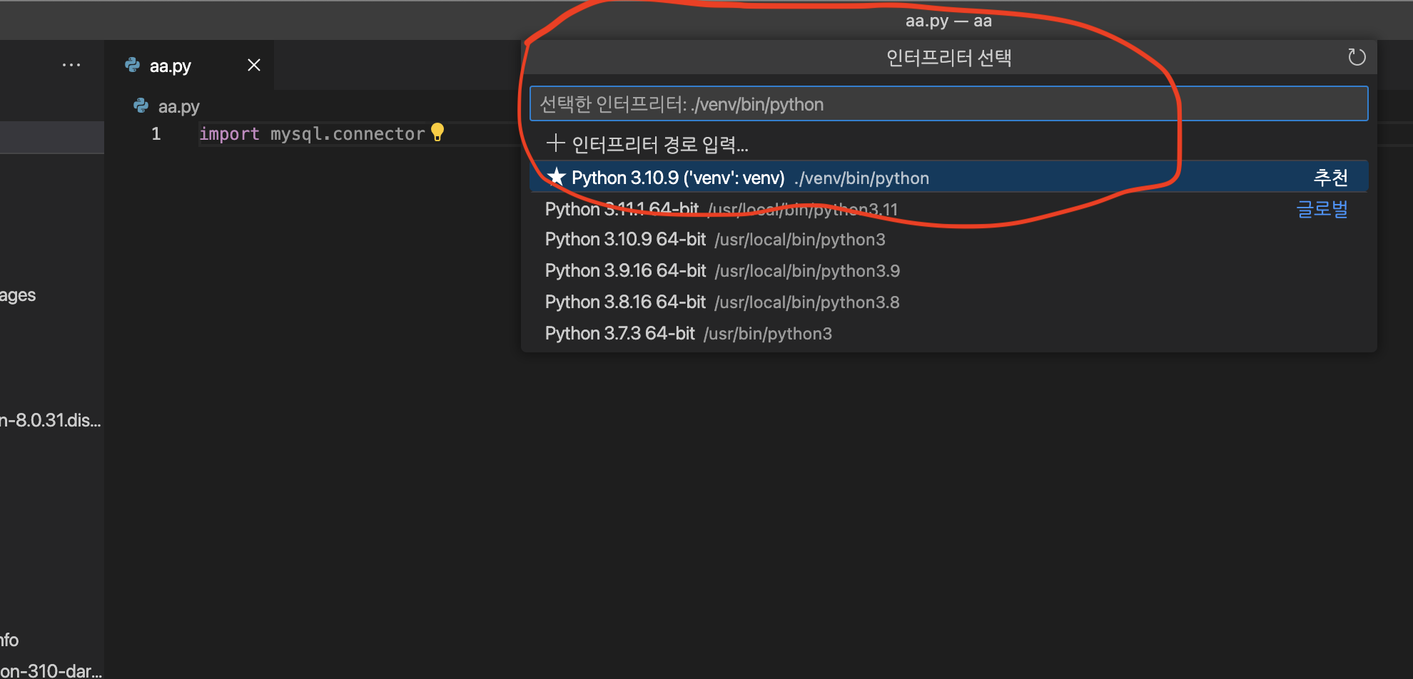VSCode 로 실행할때는 인터프리터를 가상환경 venv안에 있는 python 으로 선택해서 실행해주어야 된다.
